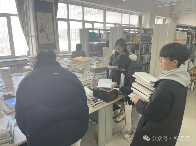 在这次志愿服务活动中,每一位同学都积极认真工作,他们穿梭在一排排的书架中,按照编号将每一本图书放在属于它们的位置上。认真工作体现的是党的无私无畏、敢于担当的精神。