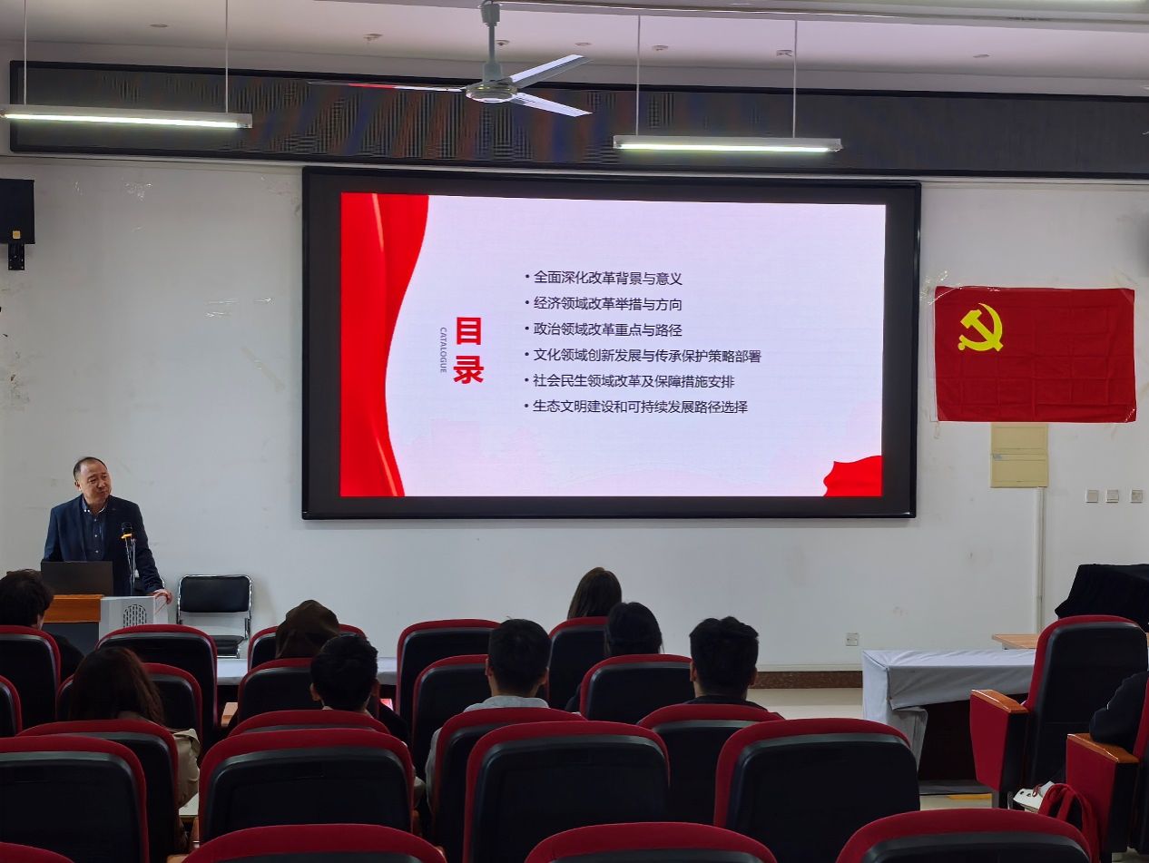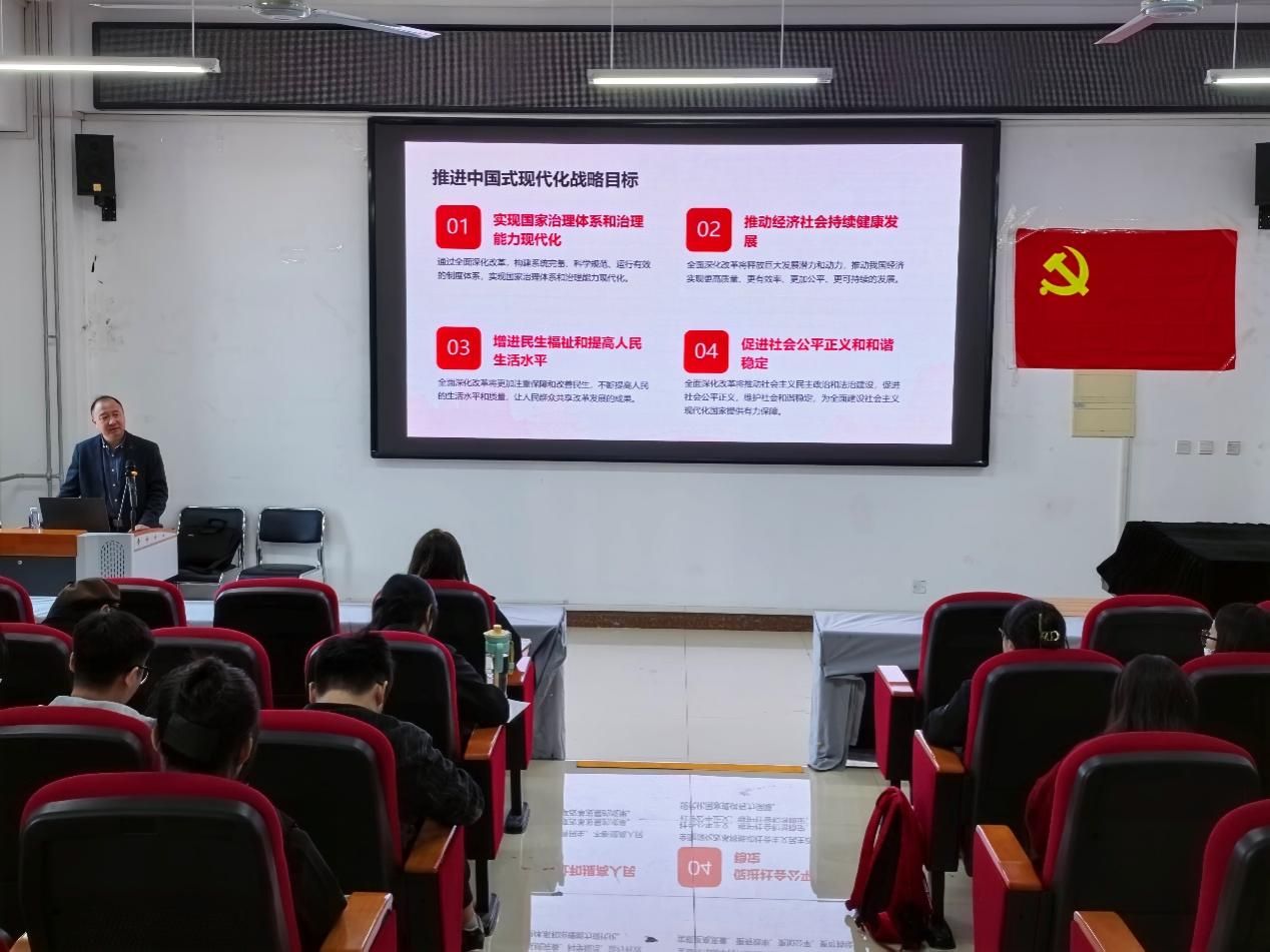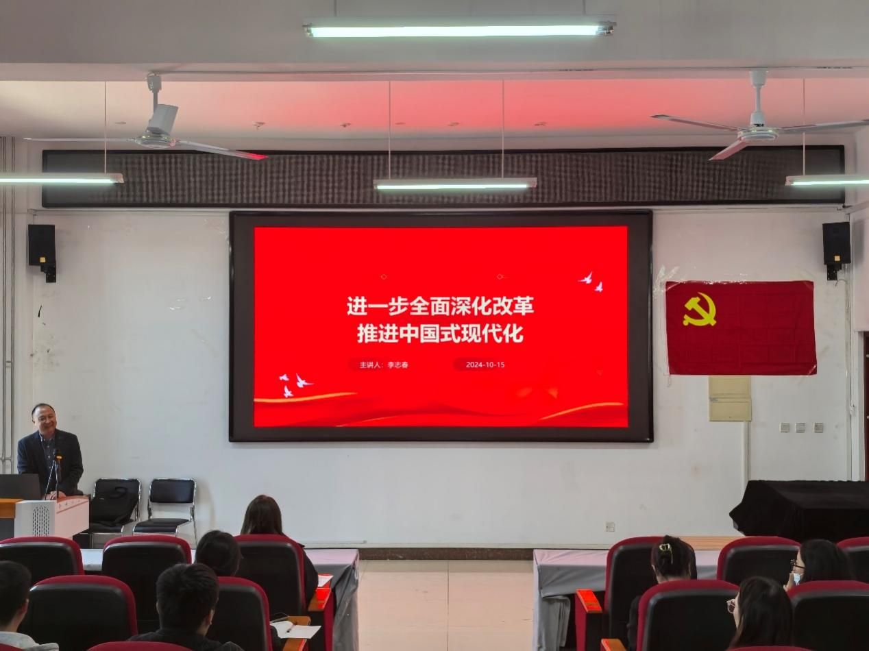 为深入理解全面深化改革对推进中国式现代化的重大意义,2024 年 10 月 15 日,我院在明德楼b401开展了 “进一步全面深化改革,推进中国式现代化” 主题党课培训,由副院长李志春主持。