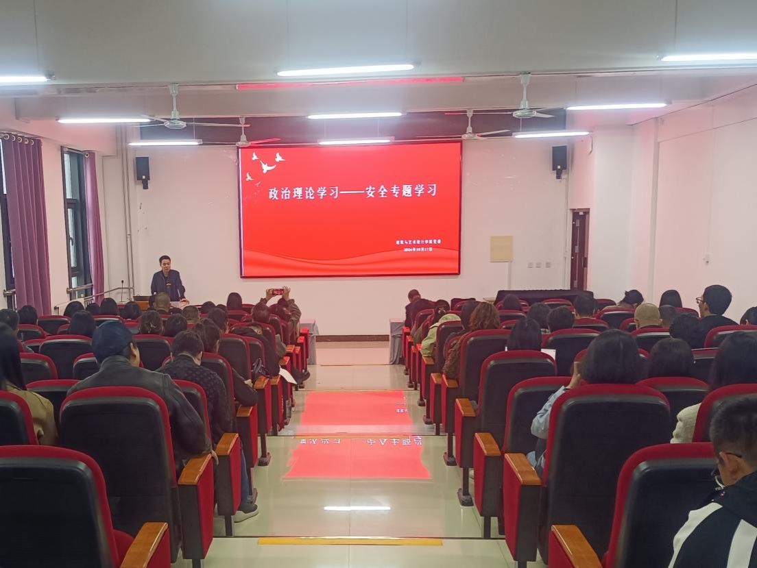 我院进行安全主题教职工政治理论学习 为进一步提高师生的安全意识,保证学院的安全稳定,2024年10月17日下午2:30,我院在明德楼B401召开教职工政治理论学习会,主题为安全专题学习,会议主持人为学院党委副书记包青虎,全院教职工参加学习。 会议领学了党中央对下半年工作的重要部署、自治区党委十一届八次全中关于安全的内容,会议指出要作为学院教师,要有主人翁意识,一是要关心学生的安全,二是要关心学院空间安全,三是要守好意识形态安全,强调教职工要把牢正确方向,将立德树人贯穿到教育教学全过程。