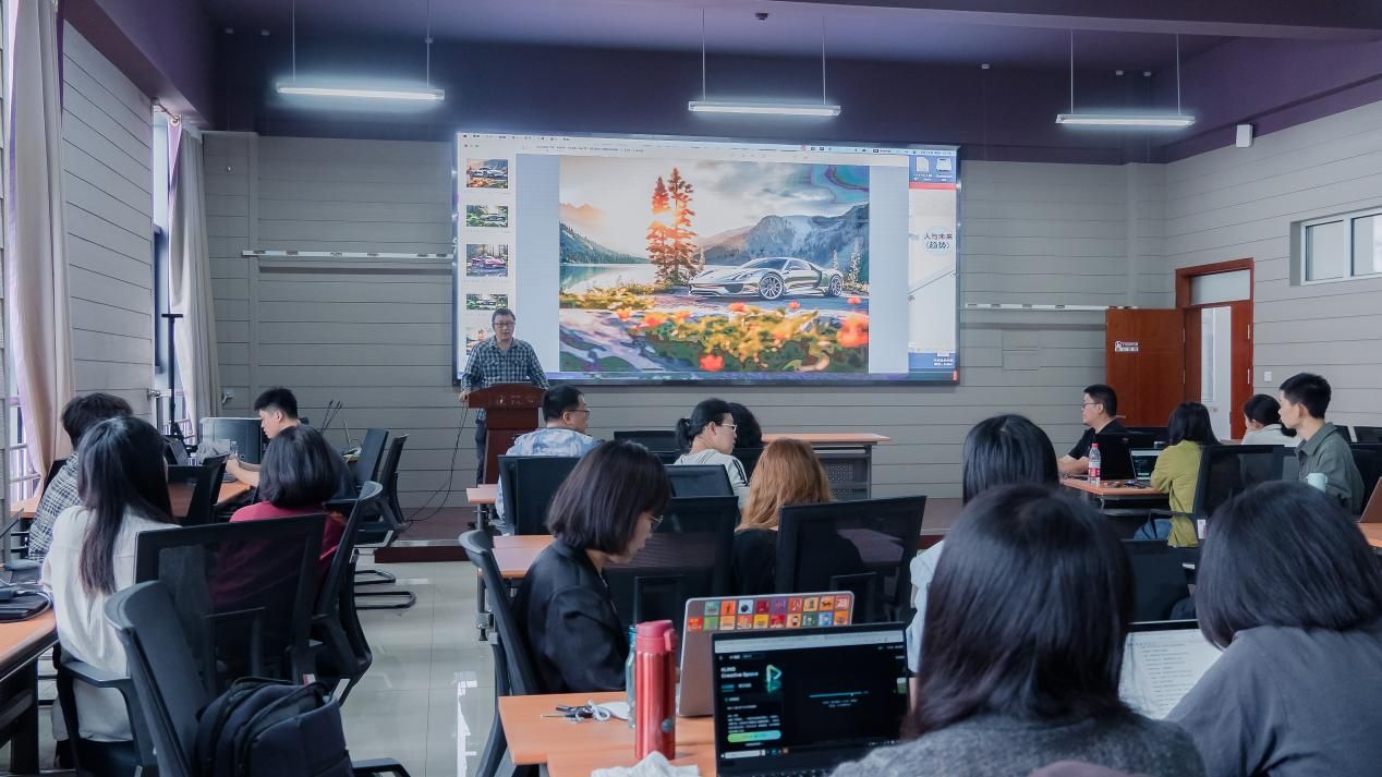 工作坊最后一天,共11组教师在学院明德楼东A501进行了精彩的成果汇报,展现了教师们对AI辅助设计的深刻理解和独特见解,每组教师汇报后邱松教授还就各组创作的作品提出了点评建议。本次工作坊的顺利举行,为教师们结合AI技术进行创作与教学打下了坚实基础。