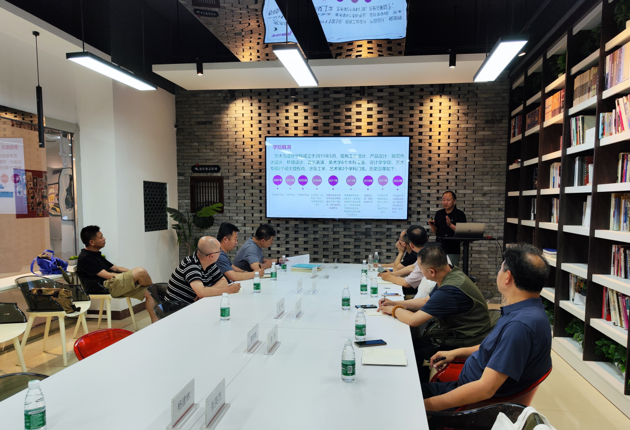 杨州院长一行参观学习了我院本科毕业设计展览、三楼工作室制教学和专业实验室,并在学院共创空间进行了座谈,韩院长对杨州院长一行的来访表示热烈欢迎。座谈会上首先由李志春副院长介绍了学院的学科专业设置、科学研究与社会服务以及未来专业建设思路,重点介绍了产品设计一流专业、OBE教育理念的人才培养模式、研究生教育、教学成果产出情况及美育实践案例,并表示双方可以在相关专业增进了解、加强合作。